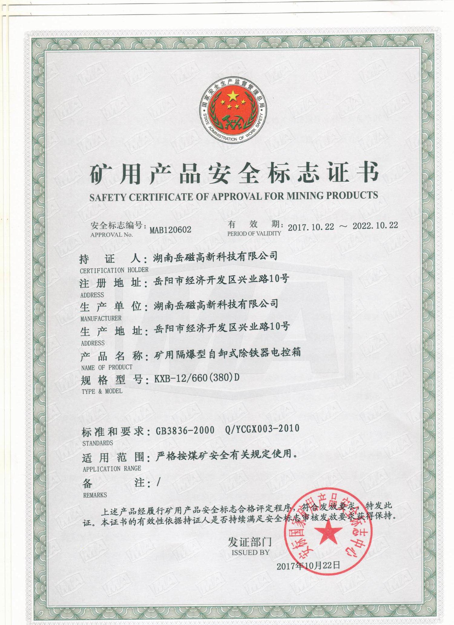 礦用產品安全標志證書